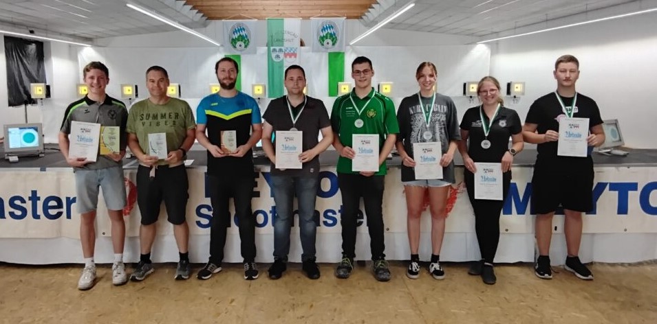 Die besten acht Einzelschützen des Endkampfes traten dann noch zu einem Finalschießen an. Dazu waren 184 Ringe nötig. Darya Schöne aus Käufelkofen gewann mit 238,5 Ringen klar vor Josef Pömmerl (Wildbachschützen) mit 233,8 Ringen. Auf den weiteren Positionen landeten Carina Königbauer, Andreas Walter, Marisa Goosens (Hohenegglkofen), Stefan Erlmaier, Alen Androic und Stefan Deindl. Der Zweitligist Wildbachschützen Landshut-Schweinbach war mit der Luftpistole nicht zu schlagen, wenngleich sich Bezirksligist Vilsheim stark wehrte (1002:1158 Zähler). Mathias Ruckerbauer (86), Markus Unterholzner (222), Celina Kathleen Jost (167) und Laura Labanca (527) behielten die Oberhand gegenüber Lukas Hadersdorfer (121), Peter Kübler (279), Axel Schönerwald (320) und Gerhard Scheubeck (438). Dritter wurden die Altschützen Mirskofen mit Respektsabstand (2145 Zähler) mit Florian Palmberger (237), Florian Forstmaier (371), Karl-Sebastian Ostermeier (739) und Tobias Kammermeier (798). Auf Platz vier kamen die Edelweißschützen Attenhausen (2303, Julian Franz 105, Ludwig Simbürger 191) vor einer weiteren Wildbach-Mannschaft (2361; Hans-Werner Lück 140, Nikolaus Jost 219) und Niederlbach (2372, Markus Selmeier 176). Im Einzelfinale dominierten drei Schweinbacher vor drei Vilsheimern. Mathias Ruckerbauer (231), Markus Unterholzner (225) und Celina Kathleen Jost verwiesen Axel Schönerwald, Peter Kübler und Gerhard Scheubeck auf die Plätze. Julian Franz wurde Fünfter und Hans-Werner Lück Sechster.